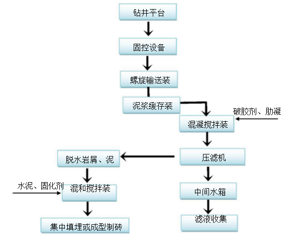 西安華揚油氣設備有限公司此工藝主要流程為:將鉆井過程中排放的廢棄泥漿通過泥漿收集箱,用泵提升送至巖屑緩存裝置,用泵提升至破乳混凝罐,用干粉投加機定量加破乳、助凝藥?;炷河商沾呻p缸泵抽至撬裝隔膜壓濾機進行固液分離,分離出來的泥餅由皮帶輸送機輸送出壓濾單元,濾液進入后續凈化處理裝置。